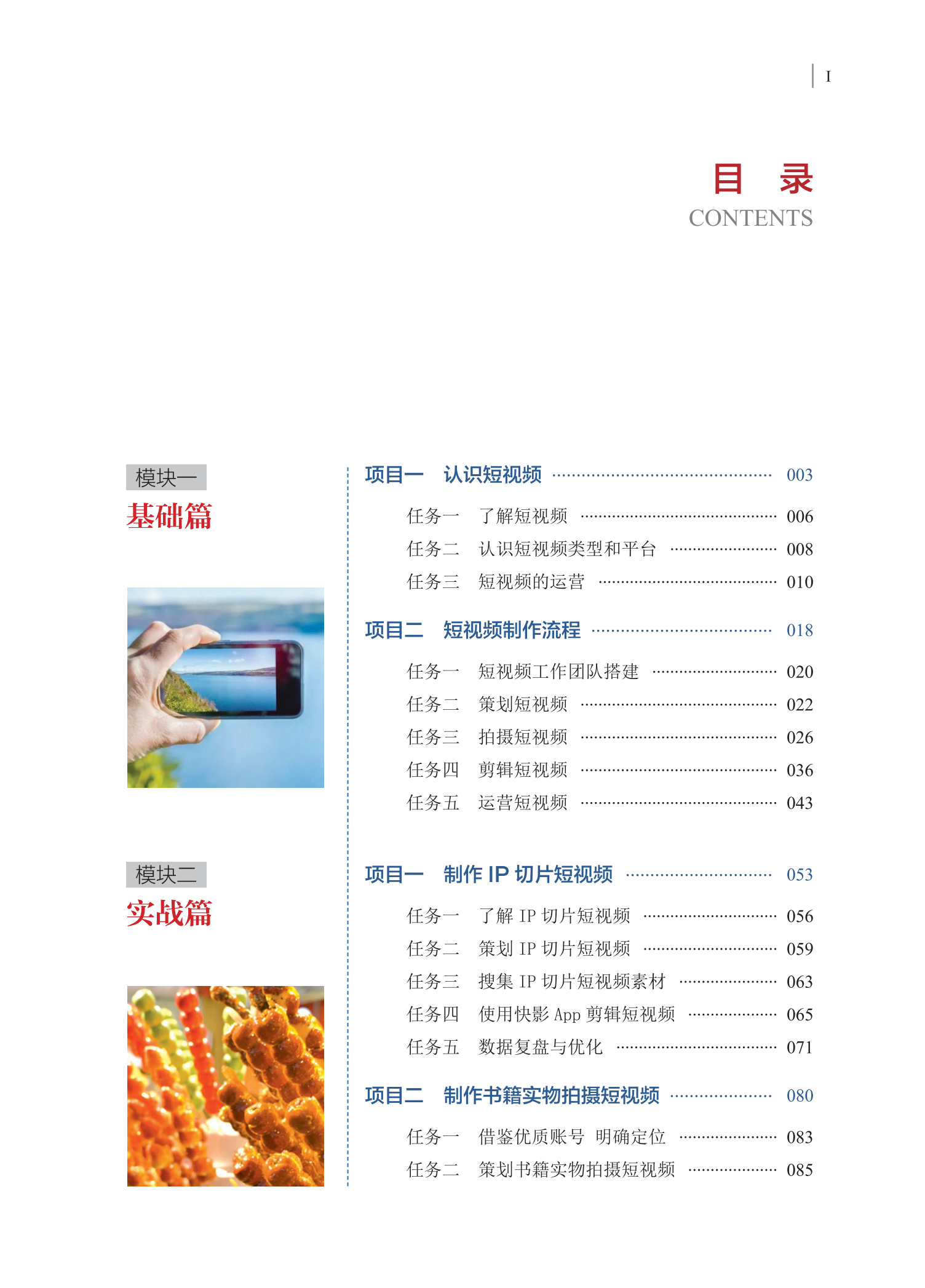 本书采用“基础一实战一综合”三阶模式系统讲解短视频创作全流程。基础篇涵盖短视频基本概念、平台特性及运营核心技能;实战篇通过制作IP切片短视频、书籍实物拍摄短视频、旅行Vlog短视频、情景类短视频四大项目,融合剪映、Adobe Premiere Pro、AI工具等技术应用,指导读者进行从策划、拍摄、剪辑到运营的全链路实操;综合实训对接技能大赛赛项,讲解特效包装与视觉创新技能。