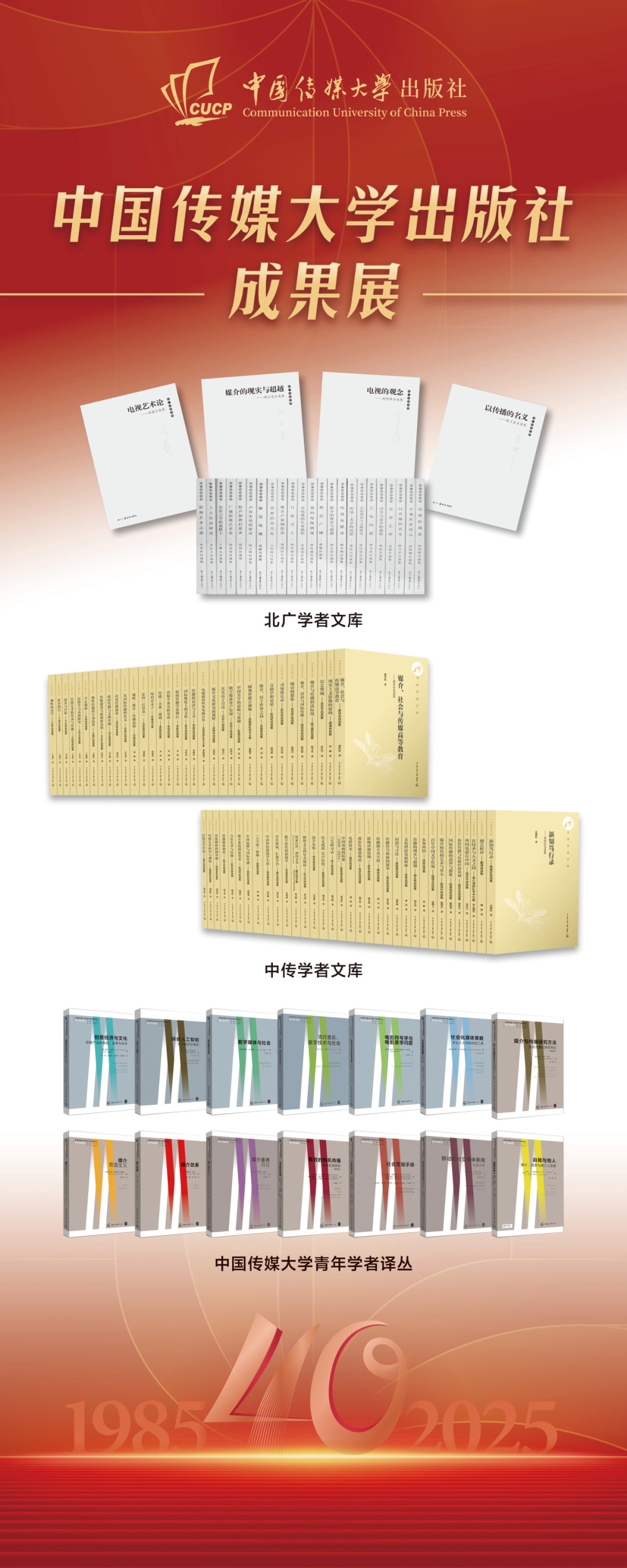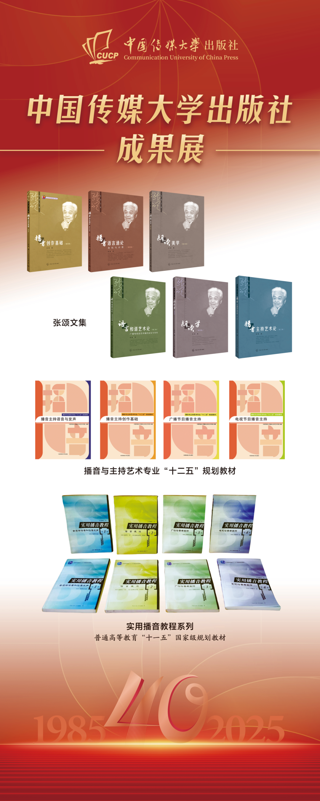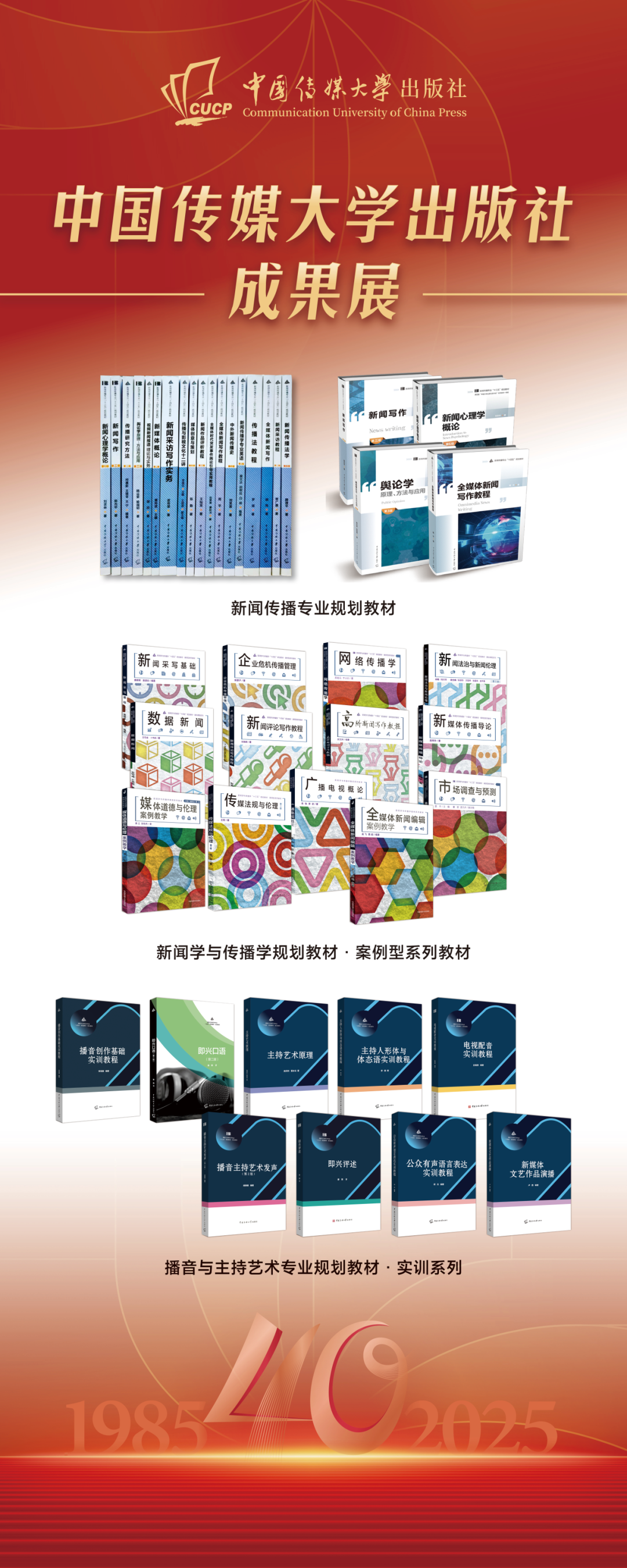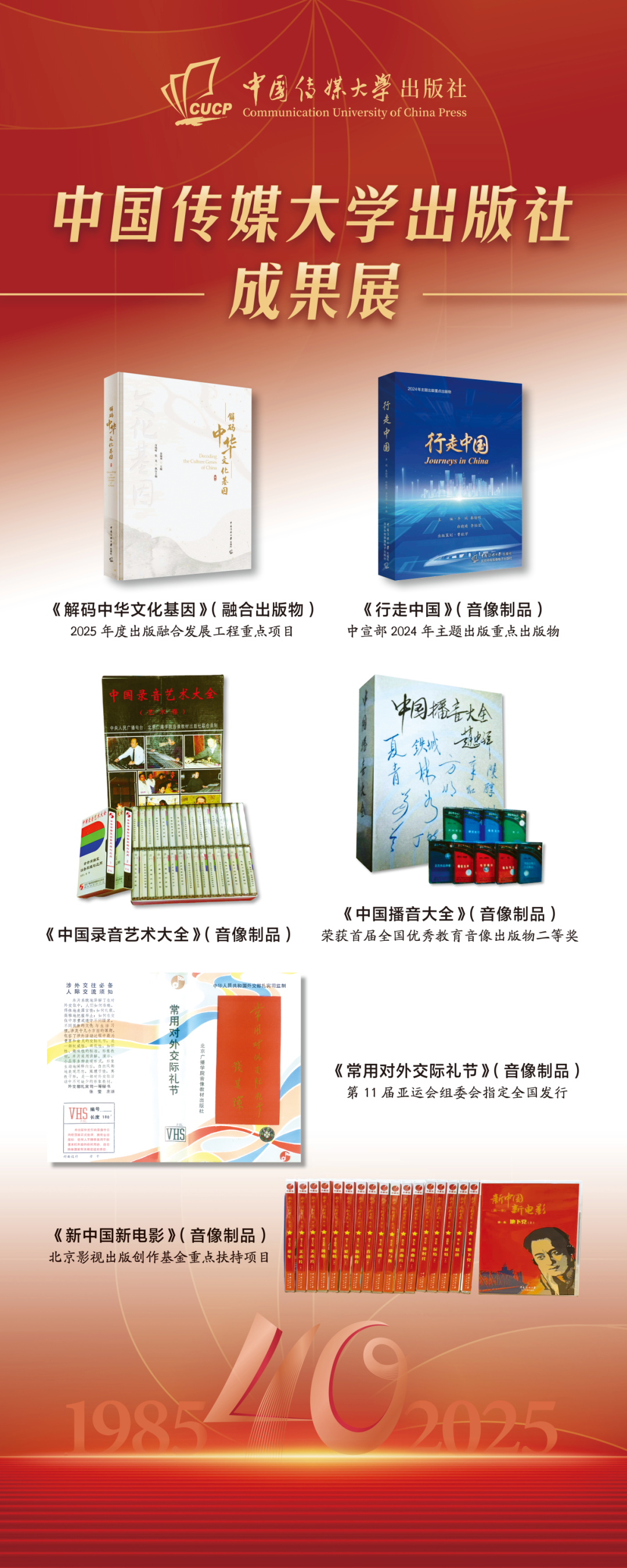 中国传媒大学出版社成果展在本次会议上同步展出。该成果展重点呈现了我社自建社以来的核心出版成果,涵盖图书、音像制品、学术期刊及融合出版物等品类,系统梳理了我社在推动学术传播与文化传承中所积淀的出版脉络,受到与会领导与专家的广泛关注与好评,彰显了我社长期以来坚守品质、深耕内容的出版传统与时代贡献。